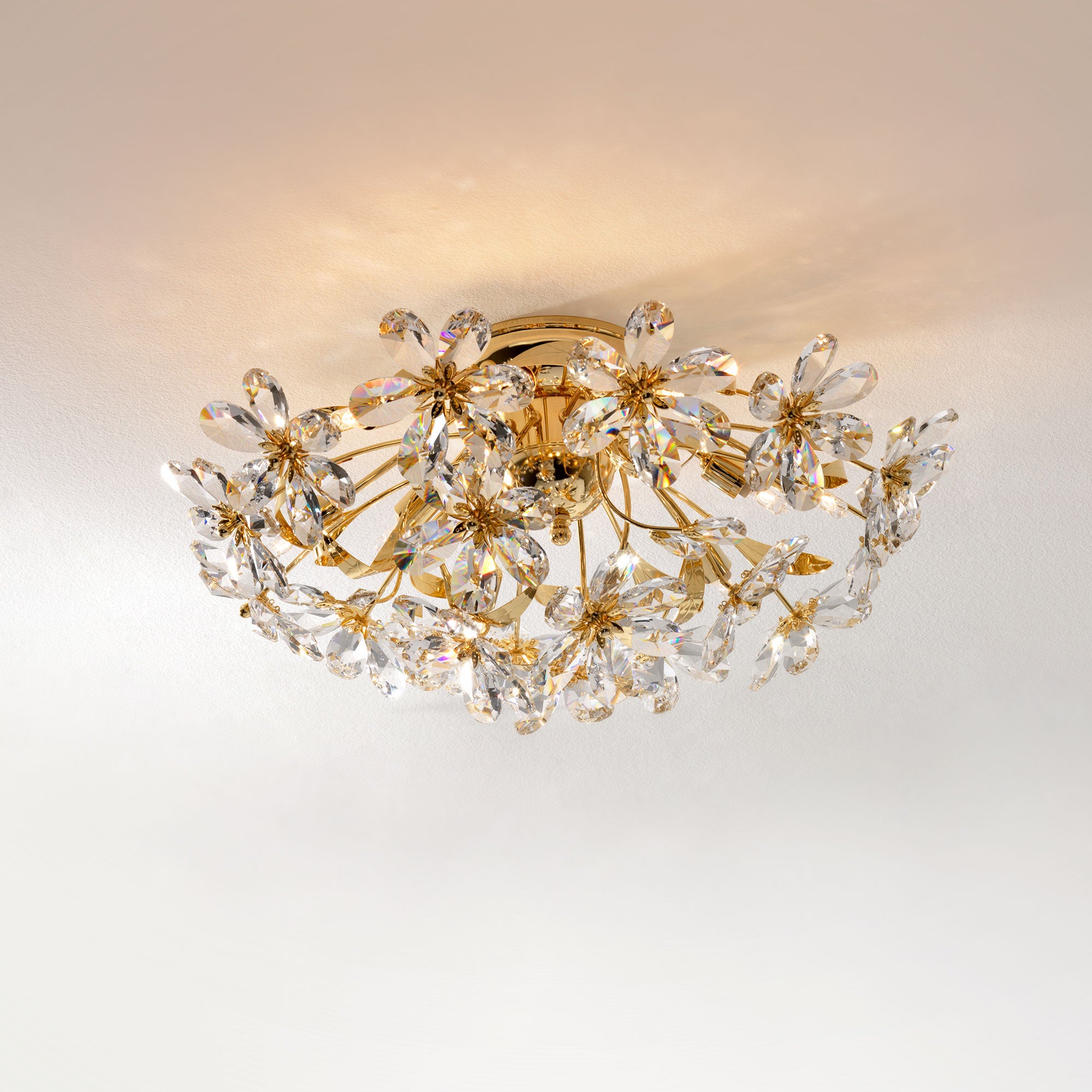 A collection characterized by a liberty line with crystal flowers and sinuous shapes that recall nature. Rich in finishings and colors to decorate and illuminate any space.