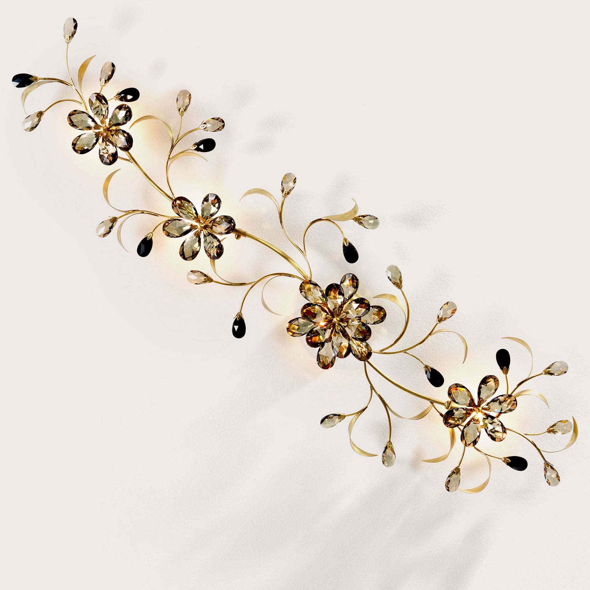 A collection characterized by a liberty line with crystal flowers and sinuous shapes that recall nature. Rich in finishings and colors to decorate and illuminate any space.