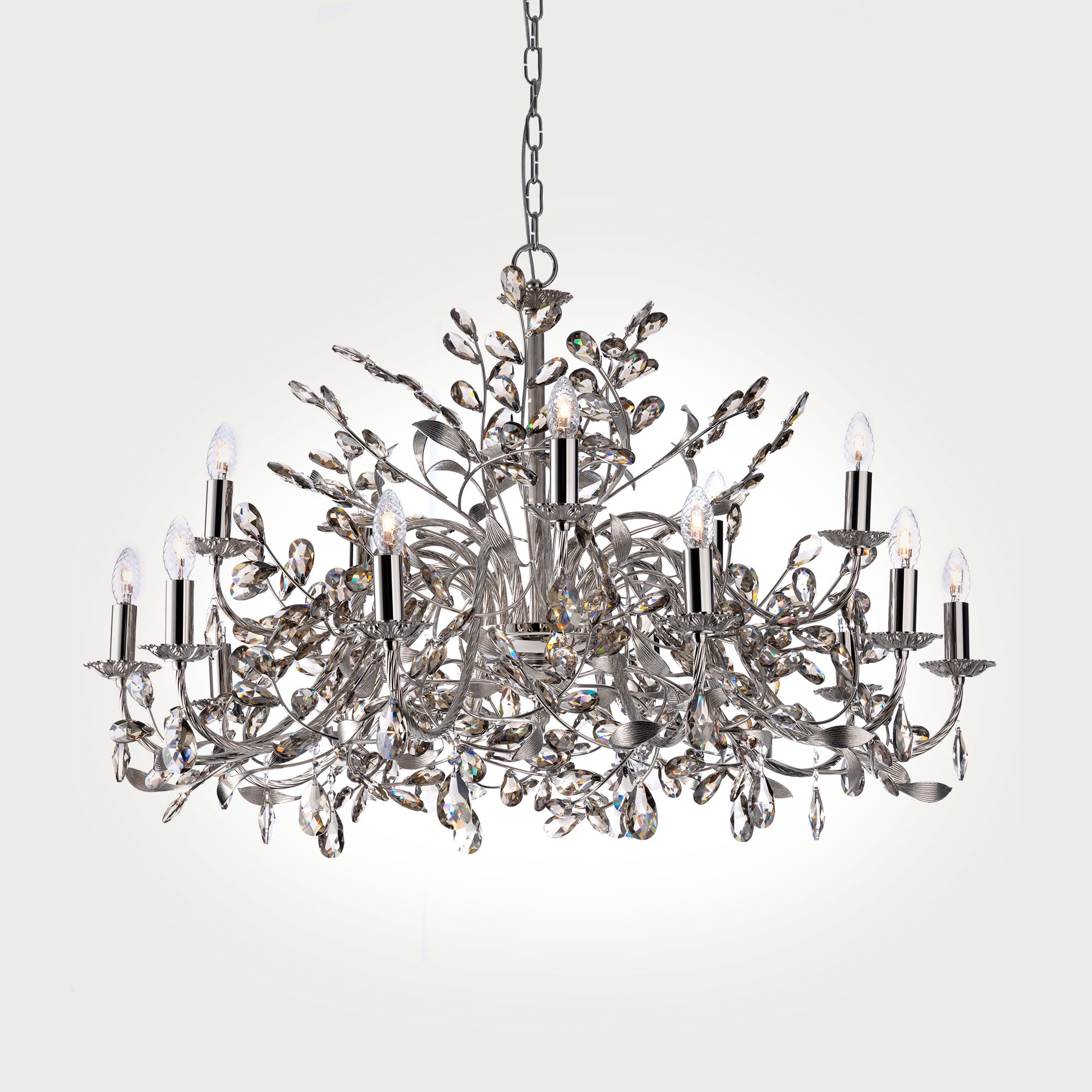 This classic line, characterized by tubular arms arranged on various levels, enriched with branches of leaves and crystal drops. Various combinations of finishes, glasses and lampshades are available.