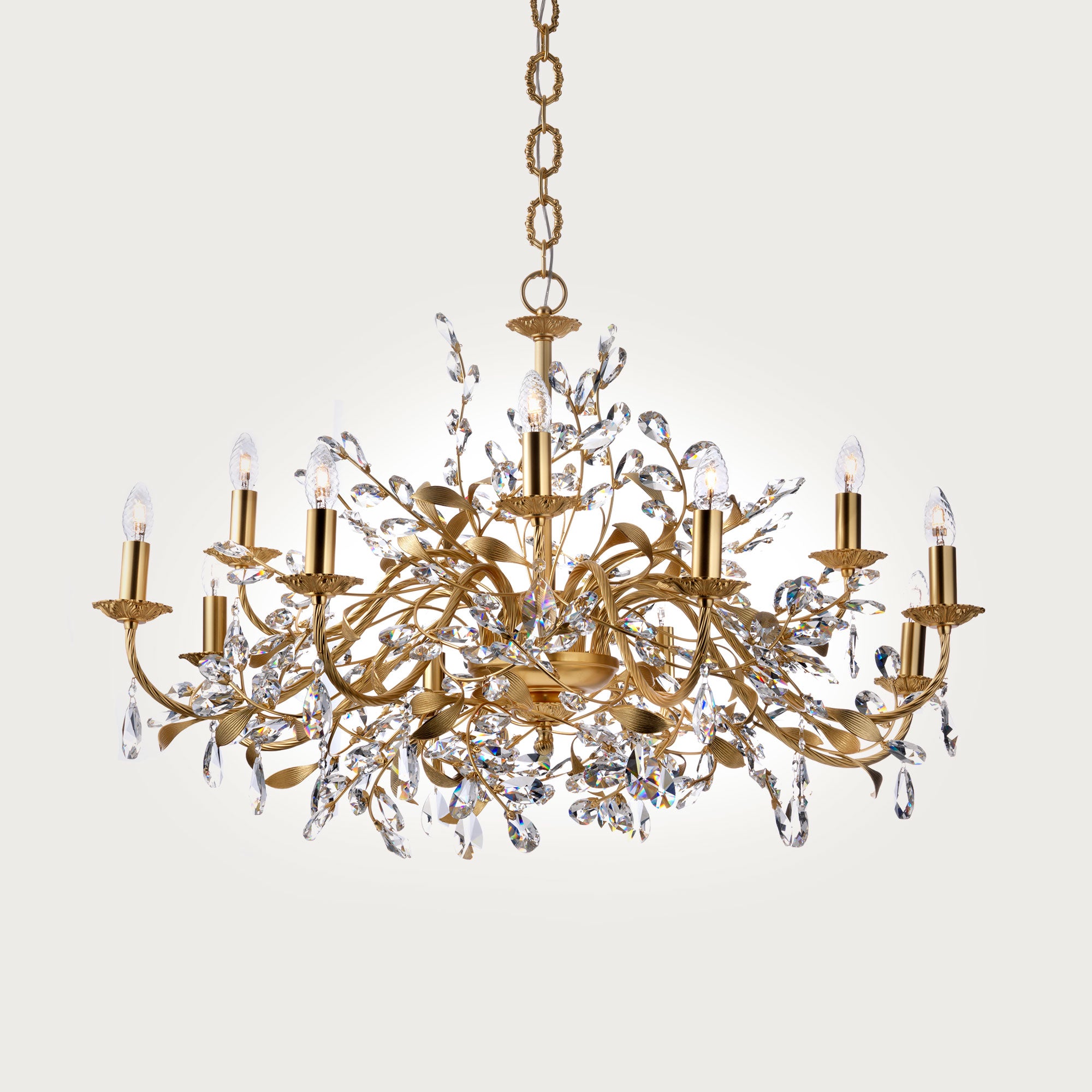 This classic line, characterized by tubular arms arranged on various levels, enriched with branches of leaves and crystal drops. Various combinations of finishes, glasses and lampshades are available.