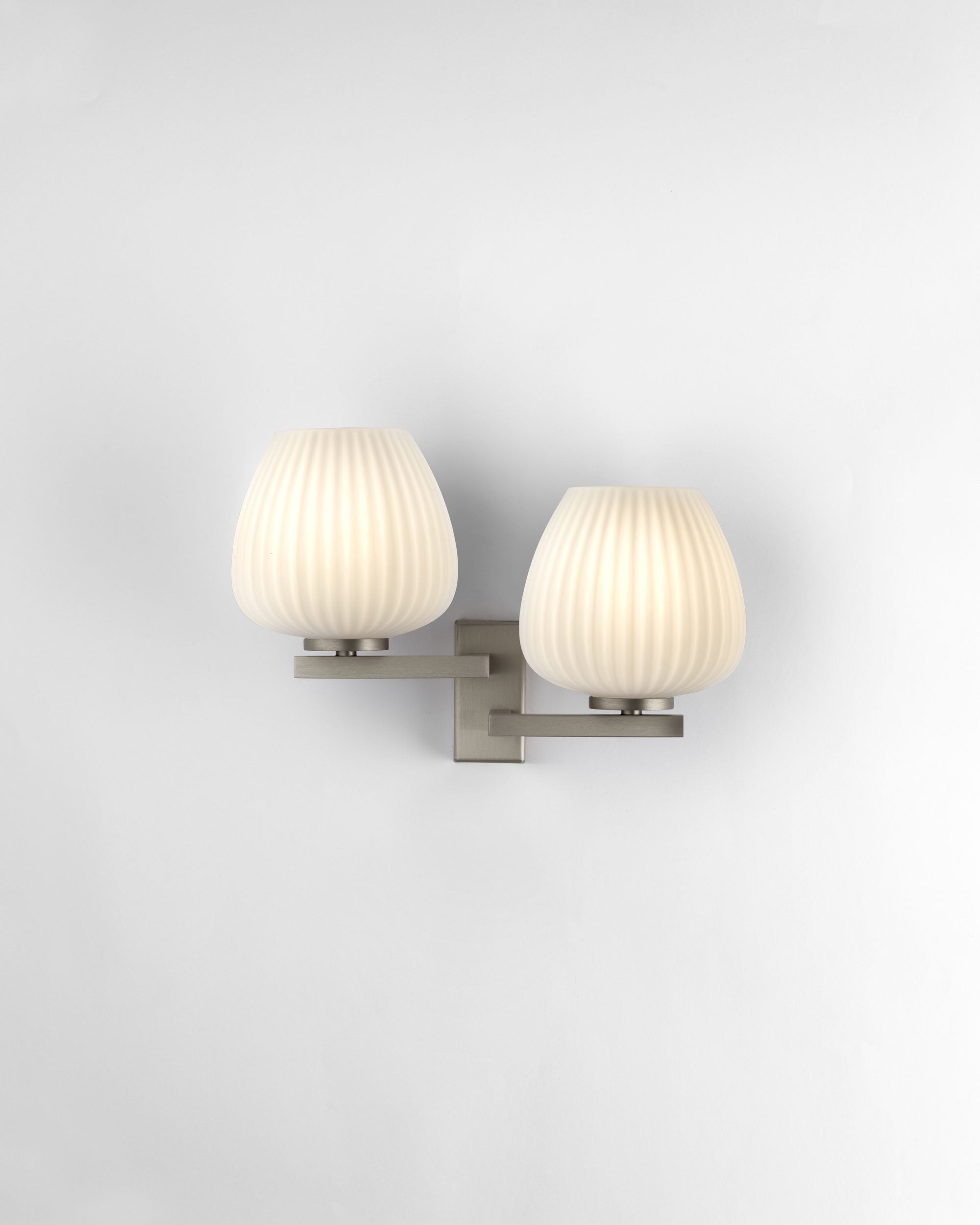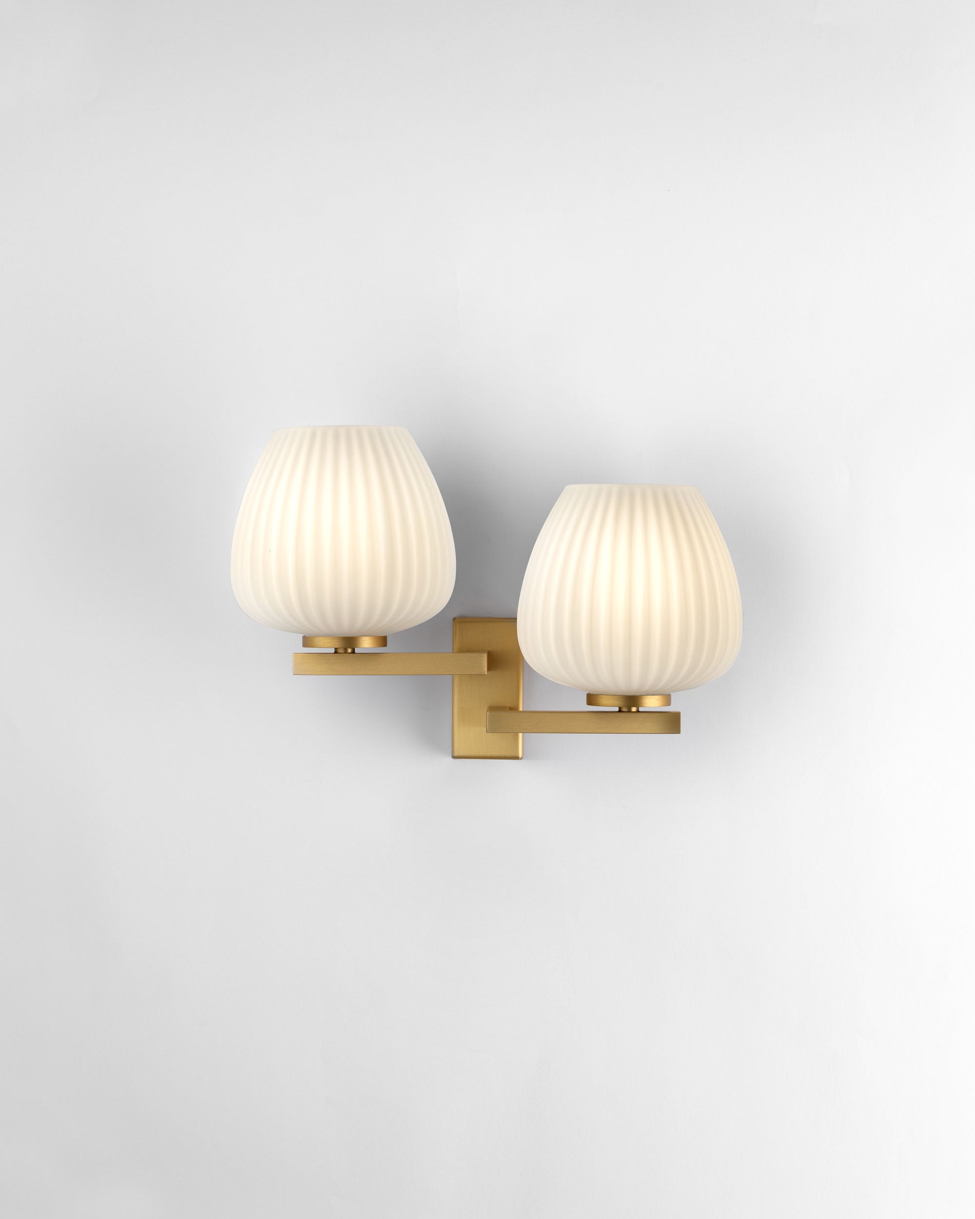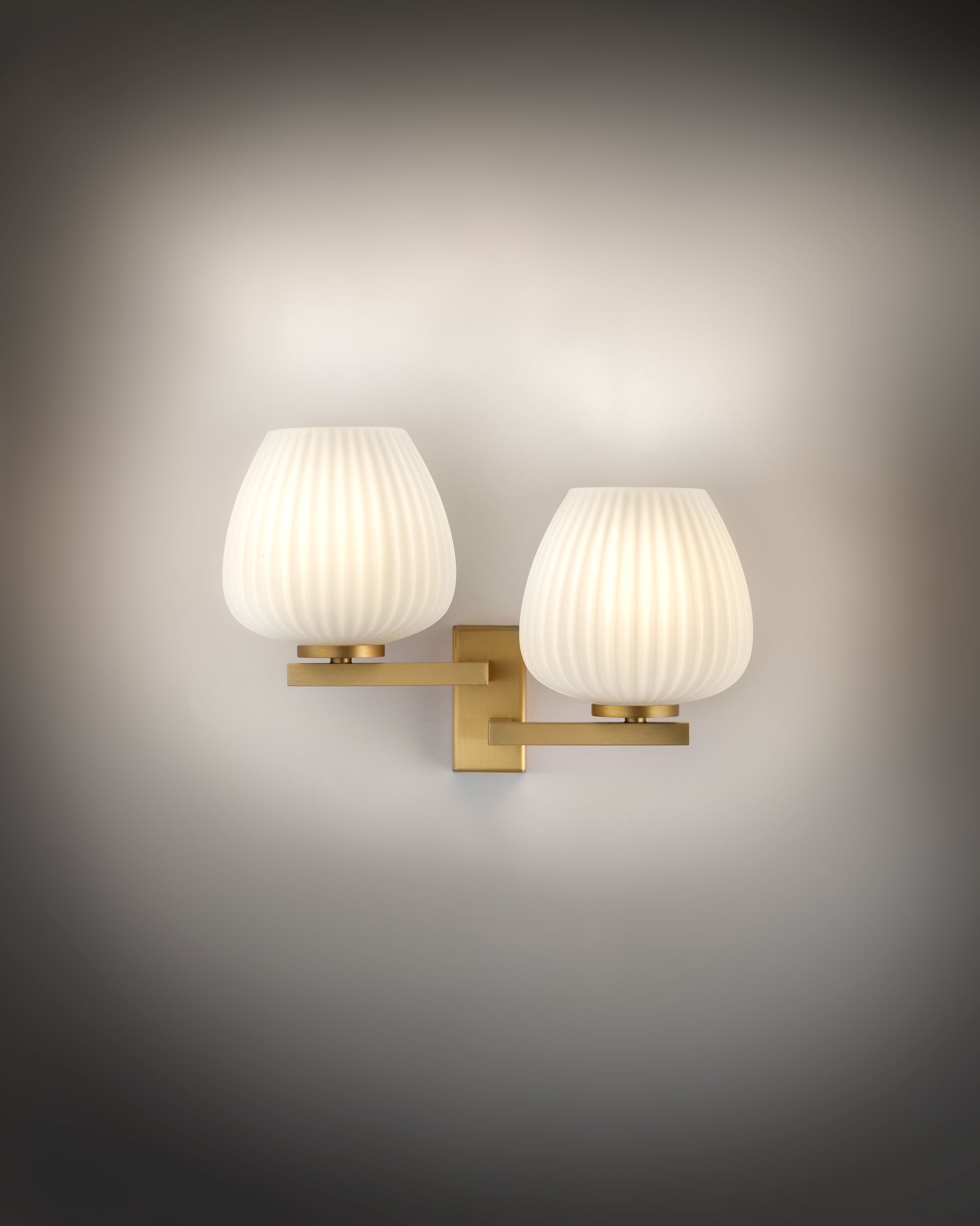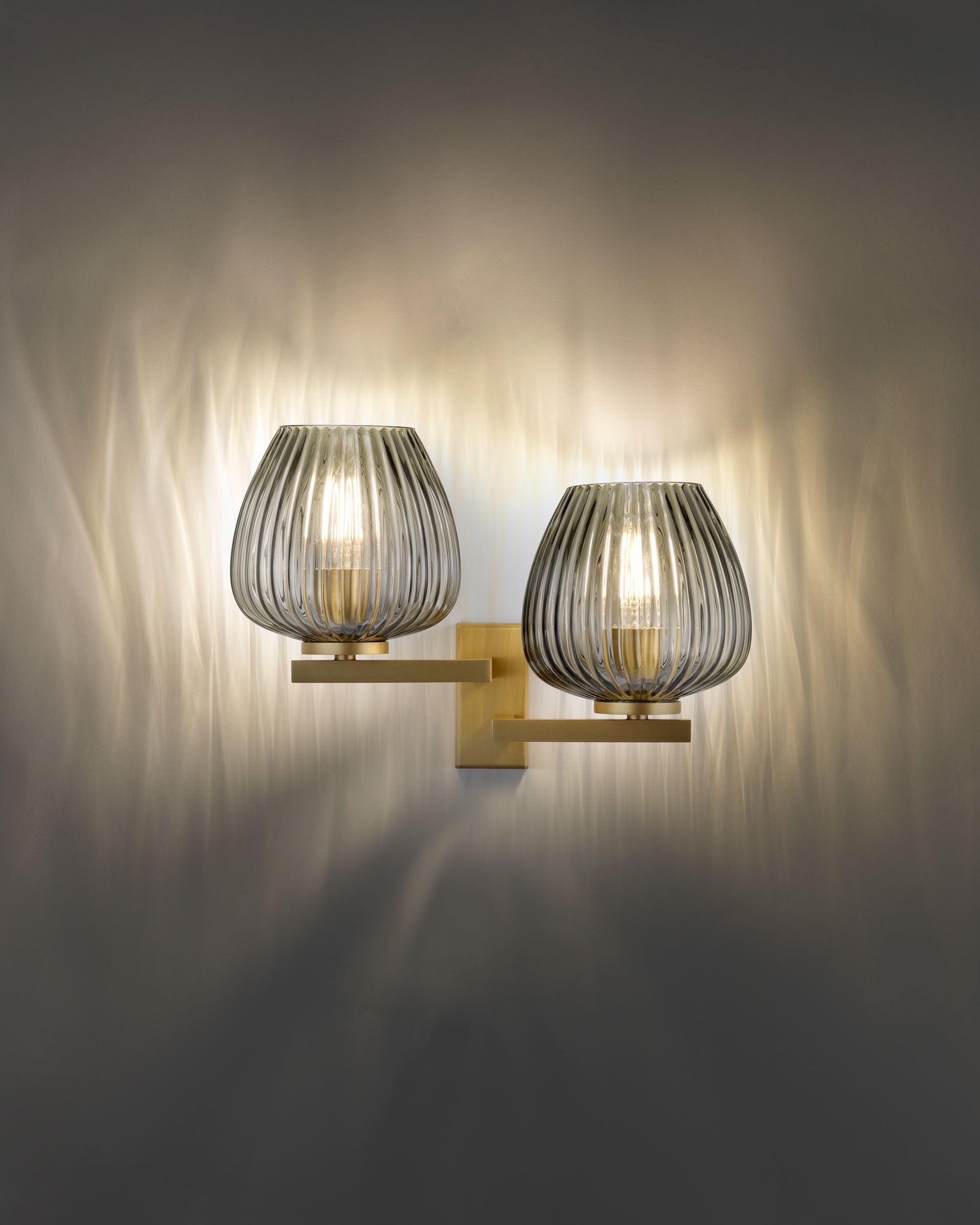 This decò-inspired line is characterized by an essential structure combined with blown glass with an elegant wavy effect obtained using antique non-circular plant molds of the Murano glass tradition.