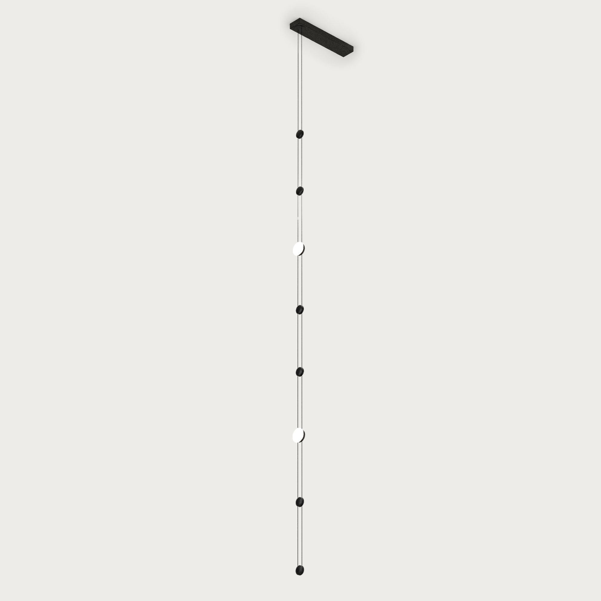 A series of elements in brass and blown Murano glass compose Code, a light system which is suspended on a pair of cables and exploits the sequence of these elements to obtain compositions with various designs and possibilities. The final look mixes technicality and visual poetry, recalling the elegance of pearl necklaces.