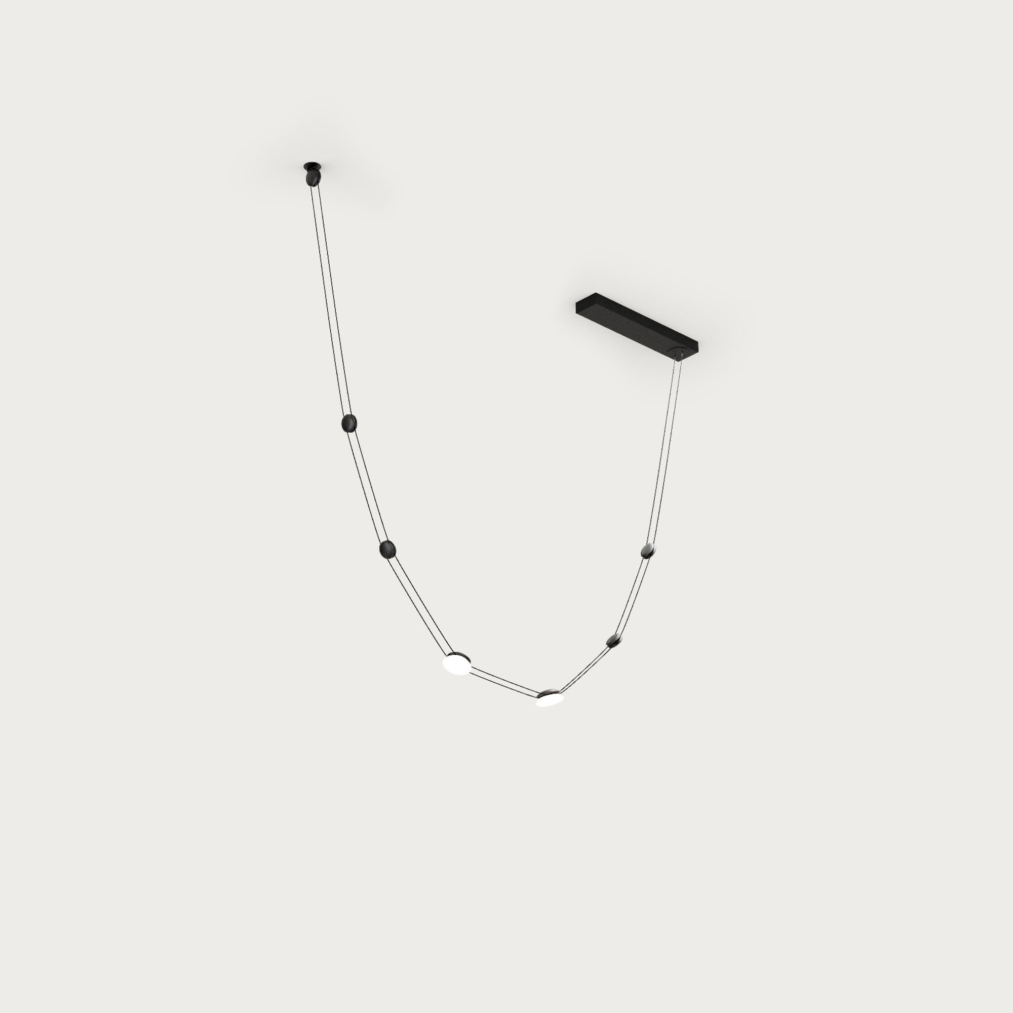 A series of elements in brass and blown Murano glass compose Code, a light system which is suspended on a pair of cables and exploits the sequence of these elements to obtain compositions with various designs and possibilities. The final look mixes technicality and visual poetry, recalling the elegance of pearl necklaces.