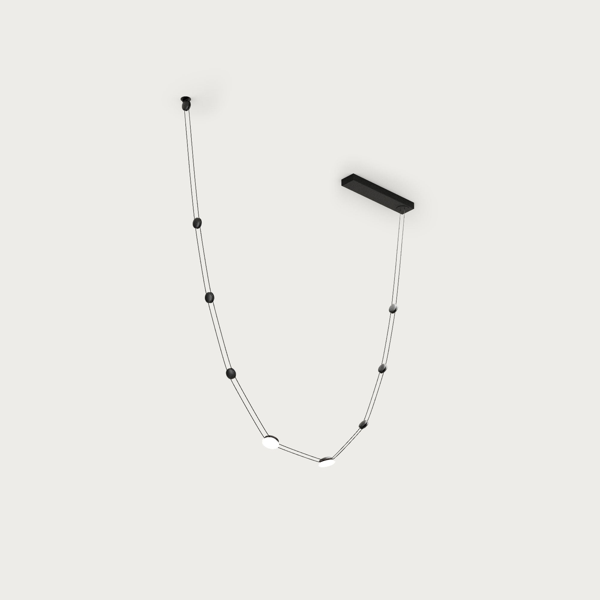 A series of elements in brass and blown Murano glass compose Code, a light system which is suspended on a pair of cables and exploits the sequence of these elements to obtain compositions with various designs and possibilities. The final look mixes technicality and visual poetry, recalling the elegance of pearl necklaces.