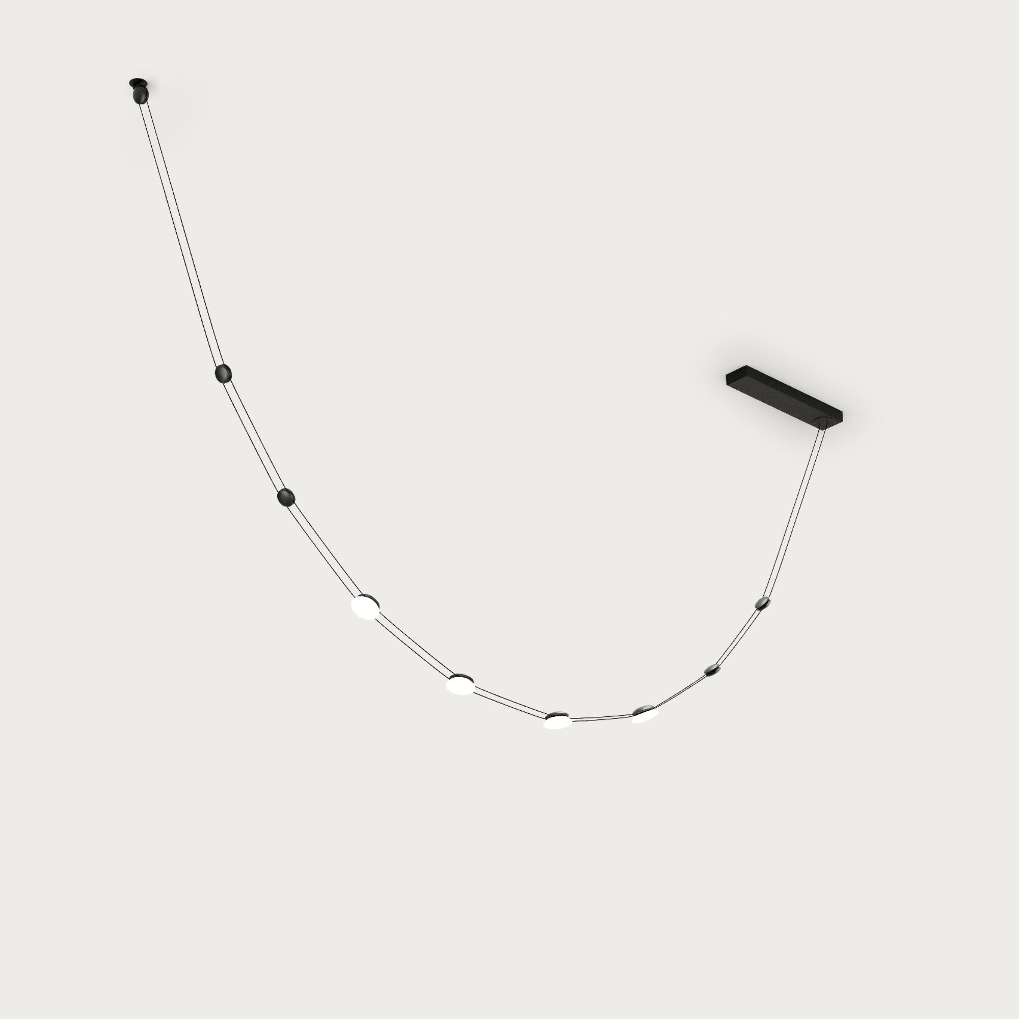 A series of elements in brass and blown Murano glass compose Code, a light system which is suspended on a pair of cables and exploits the sequence of these elements to obtain compositions with various designs and possibilities. The final look mixes technicality and visual poetry, recalling the elegance of pearl necklaces.