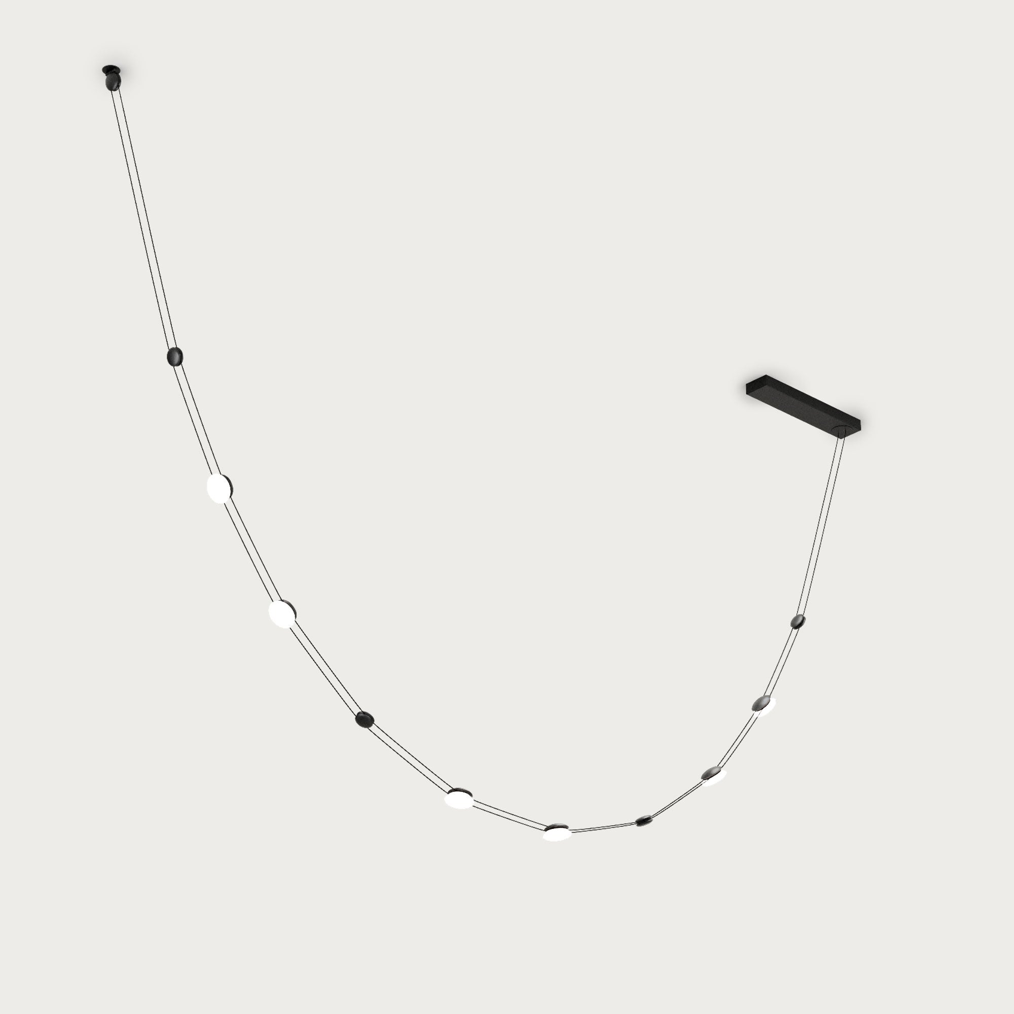 A series of elements in brass and blown Murano glass compose Code, a light system which is suspended on a pair of cables and exploits the sequence of these elements to obtain compositions with various designs and possibilities. The final look mixes technicality and visual poetry, recalling the elegance of pearl necklaces.