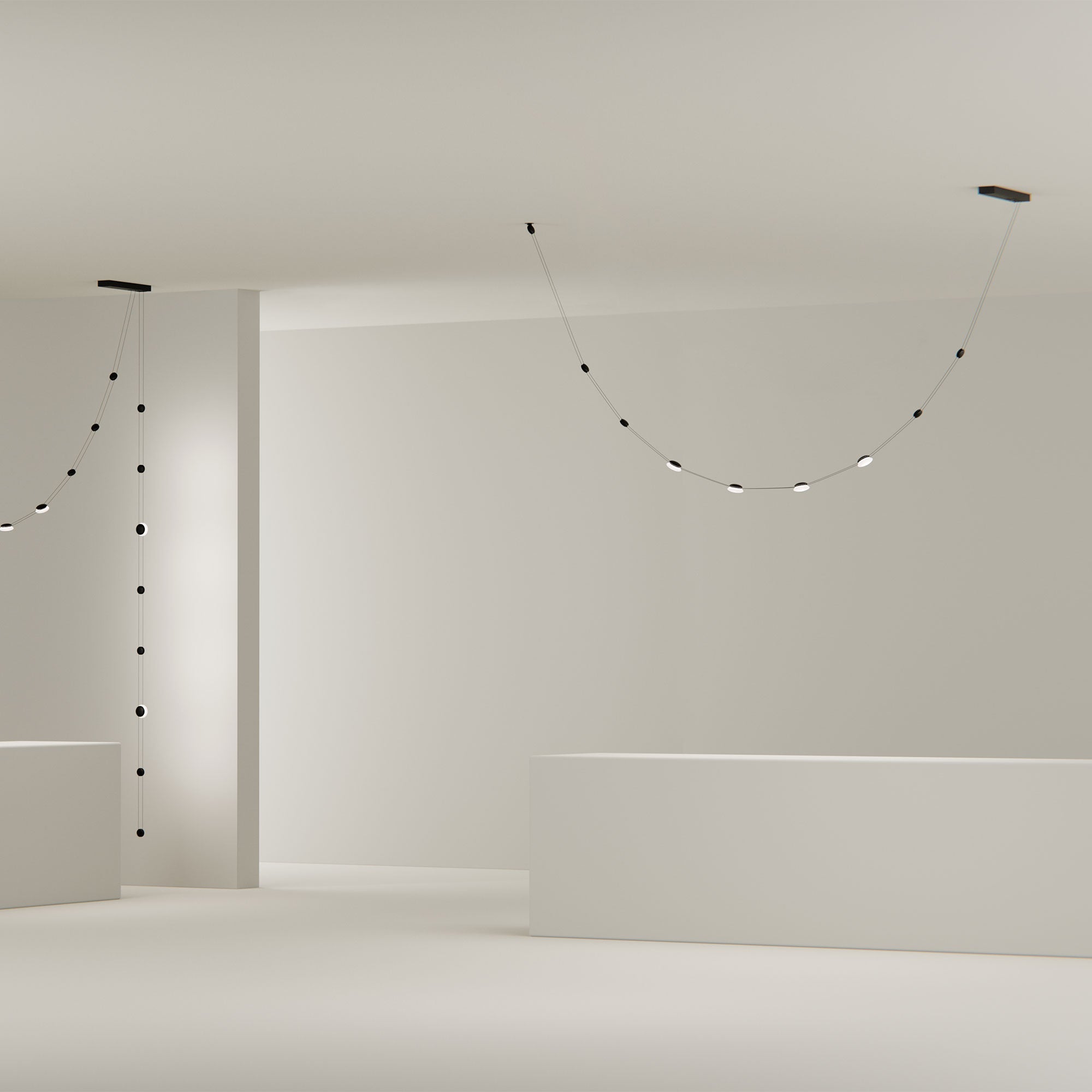 A series of elements in brass and blown Murano glass compose Code, a light system which is suspended on a pair of cables and exploits the sequence of these elements to obtain compositions with various designs and possibilities. The final look mixes technicality and visual poetry, recalling the elegance of pearl necklaces.