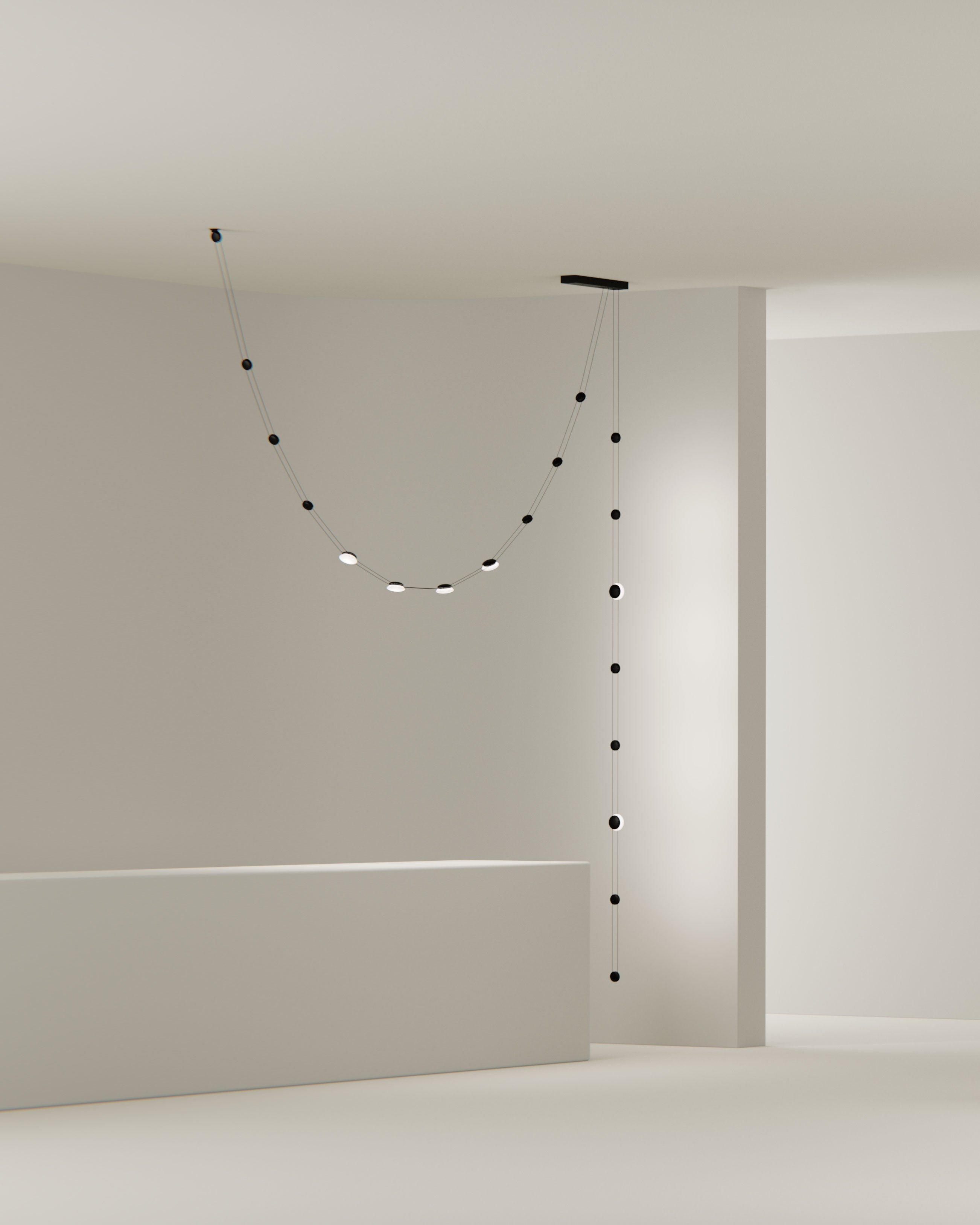 A series of elements in brass and blown Murano glass compose Code, a light system which is suspended on a pair of cables and exploits the sequence of these elements to obtain compositions with various designs and possibilities. The final look mixes technicality and visual poetry, recalling the elegance of pearl necklaces.