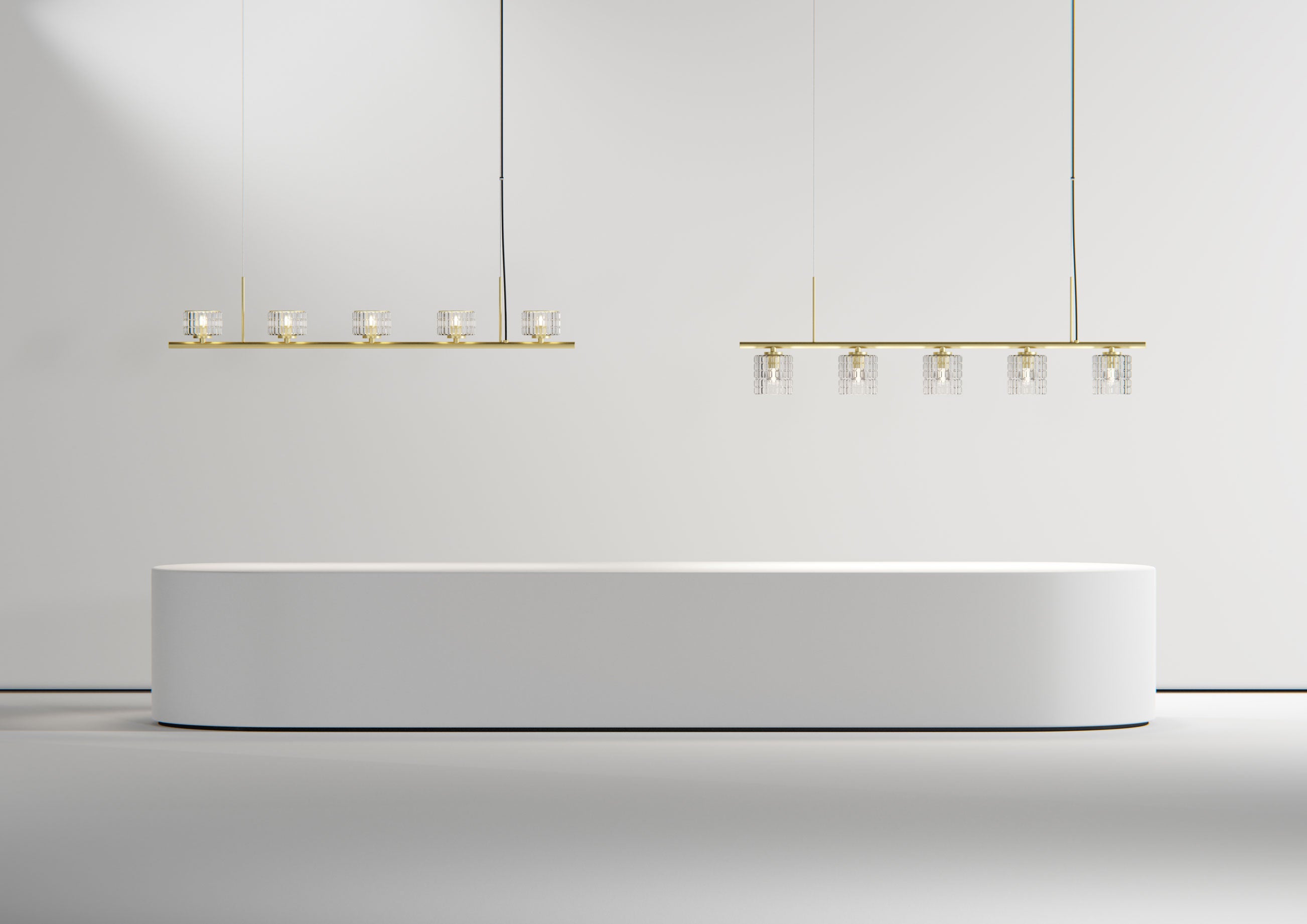 This line is characterized by structures with essential lines and important geometric shapes. Items are completed by blown glasses made using antique non-circular plant molds of the Murano glass tradition. The faceted cylindrical shape of the glass creates elegant reflections.